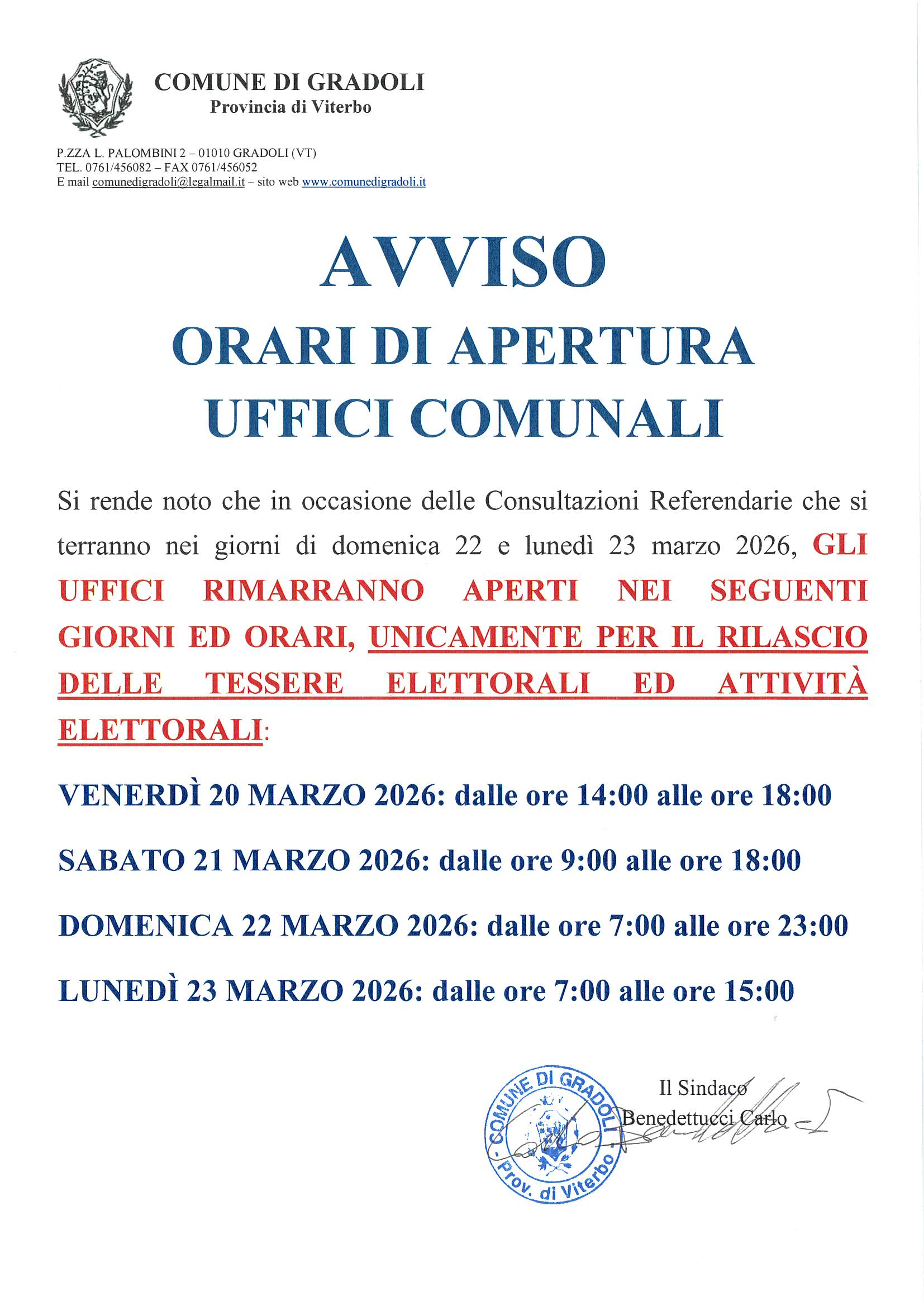 Avviso orari di apertura straordinaria Uffici Comunali Referendum 22 e 23 marzo 2026
